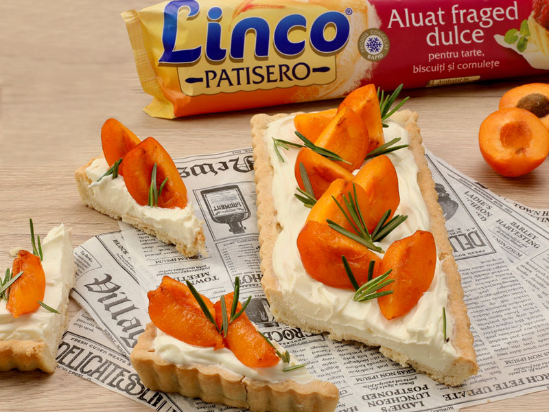 Ai nevoie de: 1 aluat fraged dulce Linco PATISERO, 200 g cremă de brânză, 200 g iaurt grecesc, ¼ linguriță esență migdale, 80 g zahăr pudră cu vanilie, 3-5 caise, 180 ml prosecco, 80 g zahăr pudră cu vanilie, 2 crenguțe de rozmarin.