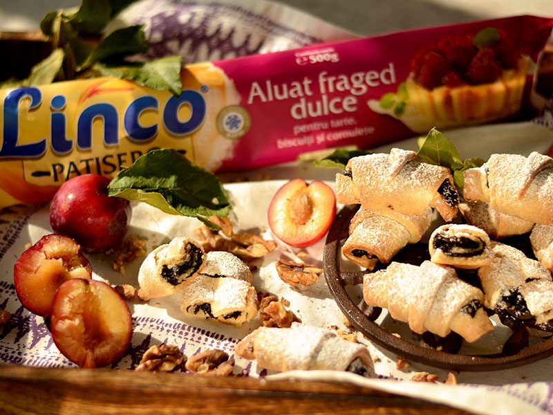 Ai nevoie de: 1 aluat fraged Linco PATISERO; 250 g magiun de prune, 2 lingurițe esență de rom, 100 g miez de nucă copt și zdrobit, 80 g zahăr pudră.