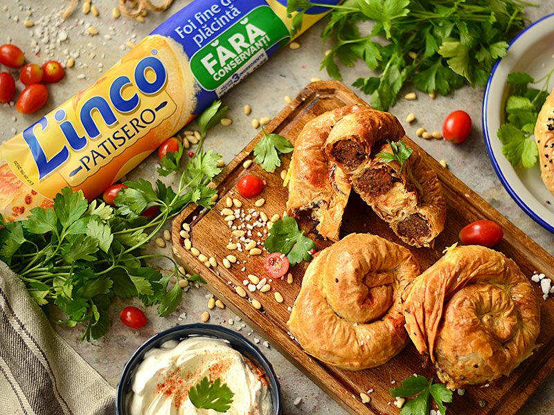 Ai nevoie de: 1 pachet foi plăcintă Linco Patisero; 800 g carne tocată amestec vită-oaie;1 ceapă roșie tocată mărunt; 5 căței de usturoi; 60 g semințe de pin prăjite; 50 g stafide; 1 legatură pătrunjel; 1 linguriță scorțișoară măcinată; ½ linguriță chimion măcinat; Piper, sare; 50 ml ulei pentru uns; 1 ou.