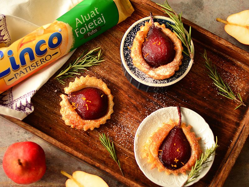 Ai nevoie de: aluat foietaj Linco PATISERO, 3 pere coapte, dar ferme, 750 ml vin roșu, 180 g zahăr, coaja și sucul de la 1 lămâie, 1 steluță anason, 1 băț de scorțișoară, 1 vârf de linguriță cu scorțișoară pudră, 1 ou pentru uns, zahăr pudră cu vanilie pentru servire, 100 g fisitic mărunțit