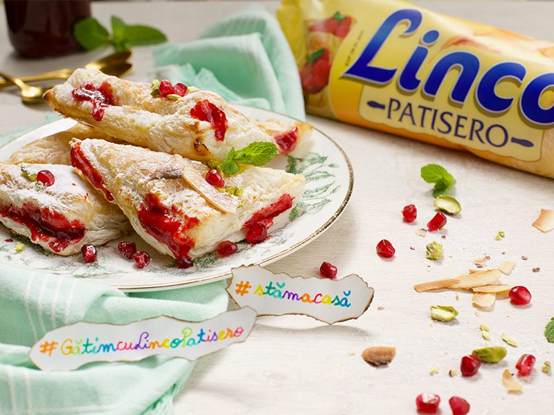 Ai nevoie de: 1 aluat foietaj Linco PATISERO, 1 borcan cu gem de zmeură (sau gemul preferat, de o consistență potrivită), 1 ou, 80 g zahăr pudră cu vanilie.