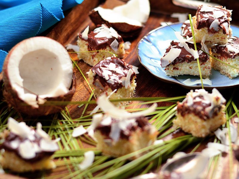 - Pentru glazură: încălzește smântâna pentru frișcă și toarnă peste ciocolata mărunțită. Omogenizează și toarnă glazura peste prăjitură. Dă la rece și decorează cu chips-uri de cocos.