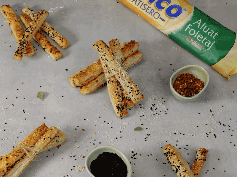 Ai nevoie de: 1 aluat foietaj Linco PATISERO 400 g, 1 ou, 50 g telemea, 1 lingură fulgi de ardei iute, 2 linguri semințe de susan, 2 linguri chimen