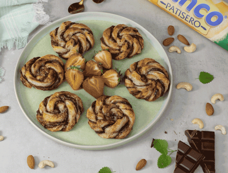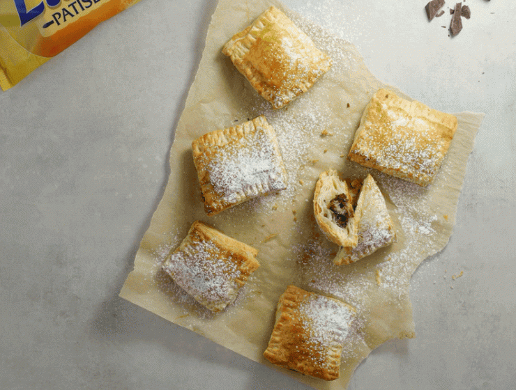 Ai nevoie de: 1 aluat foietaj Linco PATISERO 450 g, 1 banană, 8 cuburi de ciocolată…