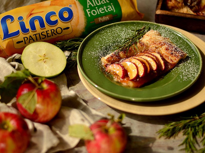 Ai nevoie de: 1 pachet foietaj Linco PATISERO 800 g, 7-8 mere mici, 1 borcan (300 g) gem de caise, 150 g miez de nucă copt și zdrobit, 1 ou pentru uns.