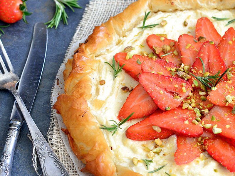 Ai nevoie de: 1 pachet foi plăcintă Linco PATISERO, 100g unt, 500g brânză ricotta, 3 ouă, 160g zahăr pudră, ½ linguriță esență lămâie, 400g căpșuni, 50g fistic, 2 crenguțe rozmarin pentru decor.