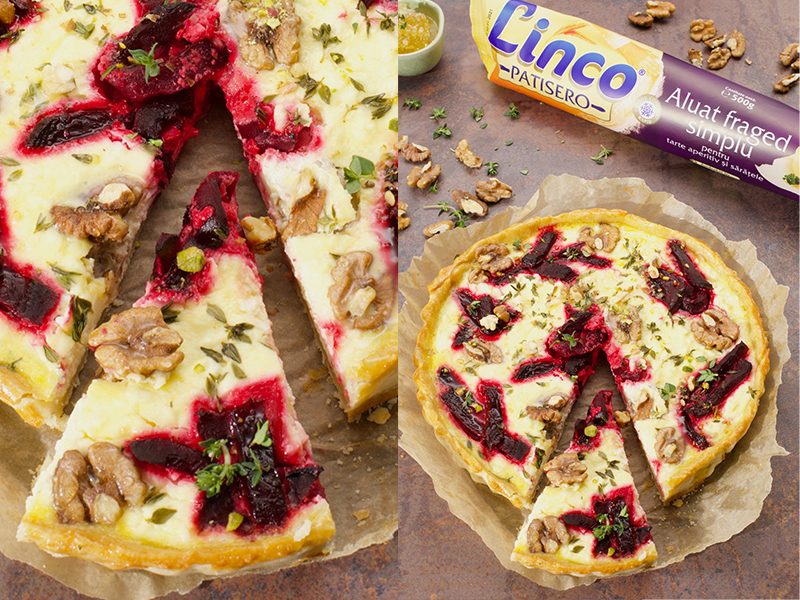 Ai nevoie de: 1 aluat fraged simplu Linco PATISERO, 250 g telemea de vacă (proaspătă), 3 linguri cu smântână 25% grăsime, 100 g sfeclă roșie, coaptă, tăiată felii, 50 g miez de nucă, 5 crenguțe cu cimbrișor proaspăt, 2 linguri cu miere, ½ linguriță sare, 2 ouă