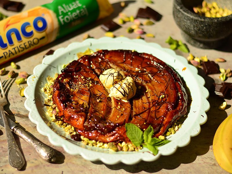 Ai nevoie de: 1 aluat foietaj Linco PATISERO 400 g, 120 g zahăr tos, 4 banane tăiate pe lungime, 100 g ciocolată neagră, 1 linguriță cu fulgi de sare, 100 g alune prăjite, înghețată de vanilie, frunze de mentă pentru decor.