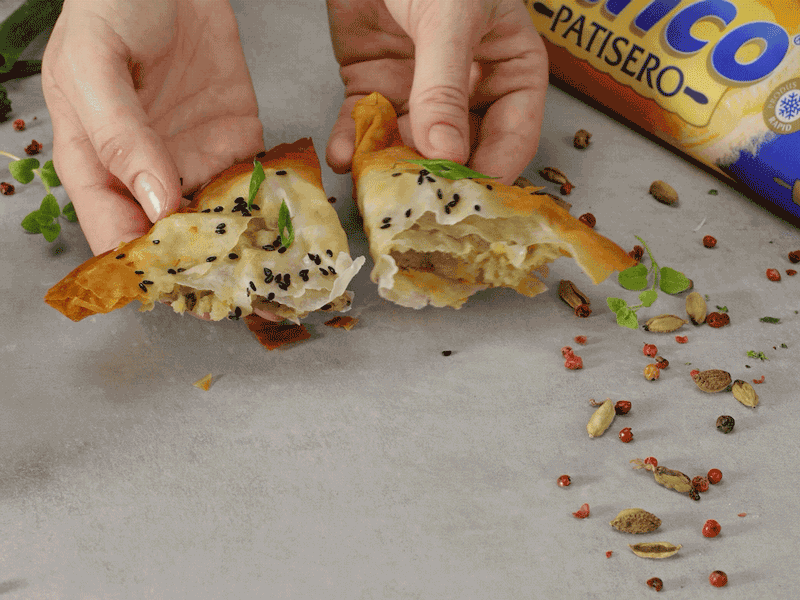 Ai nevoie de: 1 pachet foi de plăcintă Linco PATISERO, 2 linguri cu ulei vegetal, ½ linguriță semințe muștar, 2 fire de ceapă verde tocate mărunt, 1 linguriță cu ghimbir ras, 1 linguriță coriandru măcinat, 1 linguriță chimion, ½ linguriță scorțișoară, 1 linguriță sare, 1 kg cartofi pentru piure – fierți și zdrobiți, 1 legătură pătrunjel, 6 linguri cu unt topit pentru a unge foile.